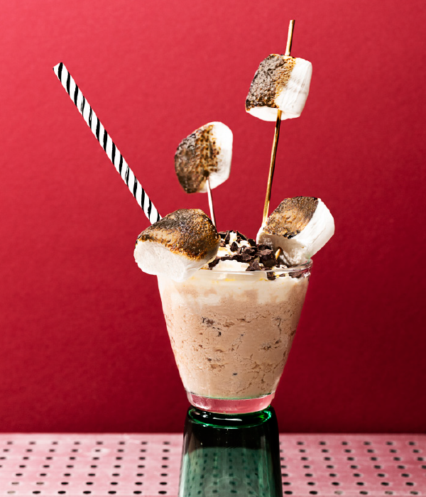 Hak de chocolade fijn. Giet de Bailey’s met wat ijs in het glas, vul aan met bruiswater. Spuit er een flinke toef slag-room op en bestrooi met gehakte chocolade. Rijg de marshmallows op een (of meer) grote cocktailprikker(s), schroei de marshmallows eventueel heel kort met de brander. Zet de prikker(s) en een rietje in het glas en serveer direct.