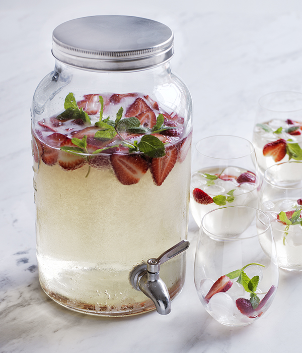 Combineer wijn, agavesiroop, bruiswater en fruit in een 2-literkom. Voor de takjes munt toe en serveer in met ijs gevulde wijnglazen of tumblerglazen.