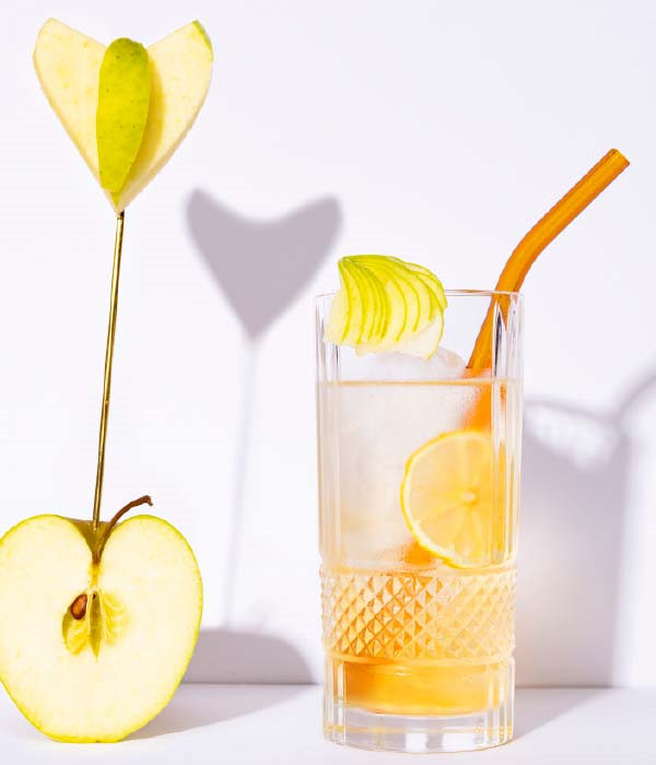 en een schijfje citroen. Vul tot bijna aan de rand met tonic en garneer met dungesneden schijfjes Granny Smith en een rietje.