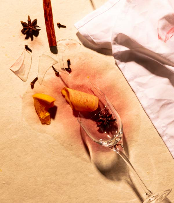 1. Doe de kristalsuiker met de wijn in een kleine steelpan en breng al roerend aan de kook. Voeg het kaneelstokje, de kruidnagels en de steranijs toe. Schaaf de gember in flinterdunne plakjes en voeg ze toe. Roer tot alle suikerkristallen zijn opgelost en laat afkoelen. Snijd een reep schil van de sinaasappel (zonder het wit) en bewaar de rest van de sinaasappel voor de garnering. Voeg de sinaasappelschil toe als de siroop een beetje is afgekoeld. Laat helemaal afkoelen in de koelkast en schenk de siroop vlak voor gebruik door een zeef.