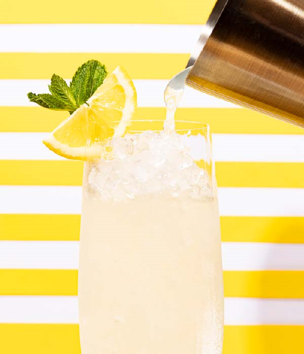 Top af met limonade. Garneer met een half schijfje citroen, een takje munt en – als-ie bloeit – een takje vlierbloesem.