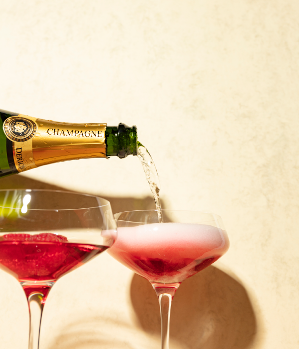 Verdeel de Frambocello over de coupes, voeg de frambozen en het rozen-water (begin echt met een druppeltje, het kan snel overheersen) toe. Vul aan met champagne of mousserende wijn. Garneer met rozenblaadjes.