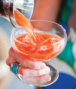 130 ml vruchtenthee op basis van hibiscus en rozenbottel 70 ml vruchtensap (zelf geperste sinaasappelen of een ander, dik, zoet vruchtensap, zoals mango of multi-vruchten) 4 cl Cointreau Sinaasappellikeur