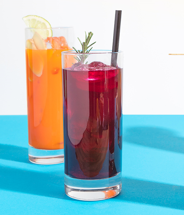 Maak rozemarijnsiroop door de suiker in 8 el water op te lossen en de rozemarijn mee te laten trekken. Voeg de afgekoelde, ingedikte siroop toe aan de sappen, de gin en het bruiswater, meng goed en schenk in een met ijsklontjes gevuld glas.