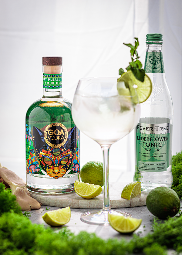 Doe de ijsblokjes in het glas. Schenk het glas vol met 1/4 GOA Vodka. Vul aan met Elderflower tonic en garneer met limoen of verse munt.