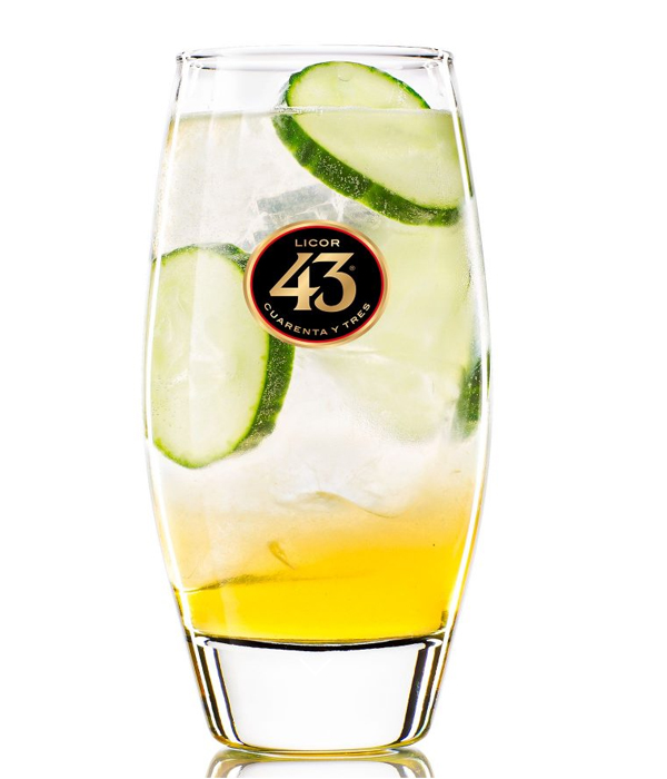 Vul een glas tot de rand met ijs. Voeg eerst 35 ml Licor 43 toe, daarna 15 ml vers limoensap. Top daarna het glas af met tonic. Snijd vier plakjes komkommer en voeg deze toe.