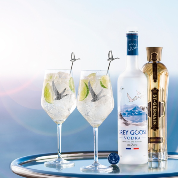 2. Schenk de Grey Goose® Vodka en St-Germain® vlierbloesemlikeur in het glas.