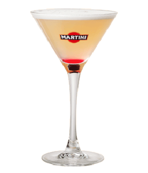 Shake de ingrediënten en schenk uit in een cocktailglas.