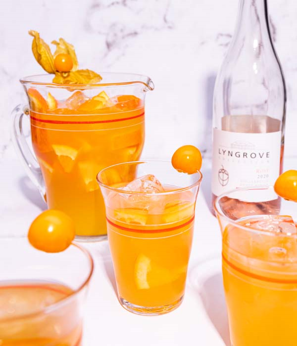 Snijd de sinaasappels in partjes en doe ze met de gin, de rum, het sinaasappelsap en ijsklontjes (hoeveelheid naar smaak) in de karaf en vul al roerend aan met de rosé.