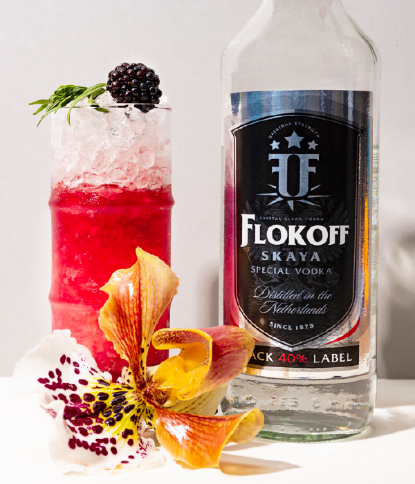 Schenk de vloeibare ingrediënten een voor een voorzichtig in een met crushed ijs gevuld glas. Roer pas vlak voor je een slok neemt van deze lekker lazy, easy, bitterzoete zomermixdrank, zodat de Flokoff Skaya Black vodka, de bramenlikeur en het sap zich nog maar deels mengen in het glas. Garneer - als je wilt.