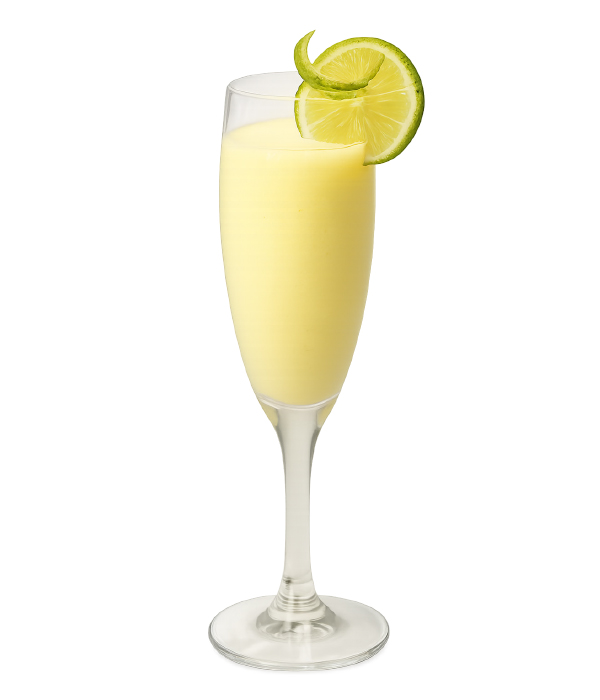 • Schep het mengsel in de coupes en garneer met de gekrulde limoenschil.