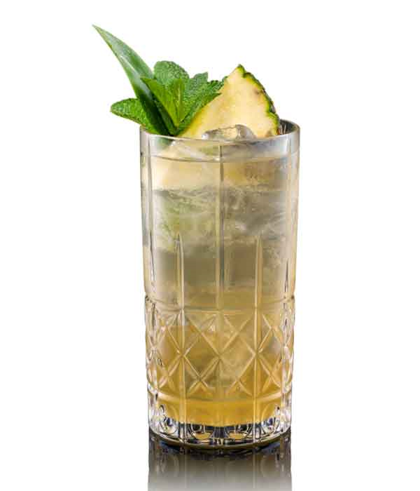 Shake goed en strain in een longdrink glas met ijs. Vul af met het sodawater en voeg als garnering een takje mint en een partje ananas toe.