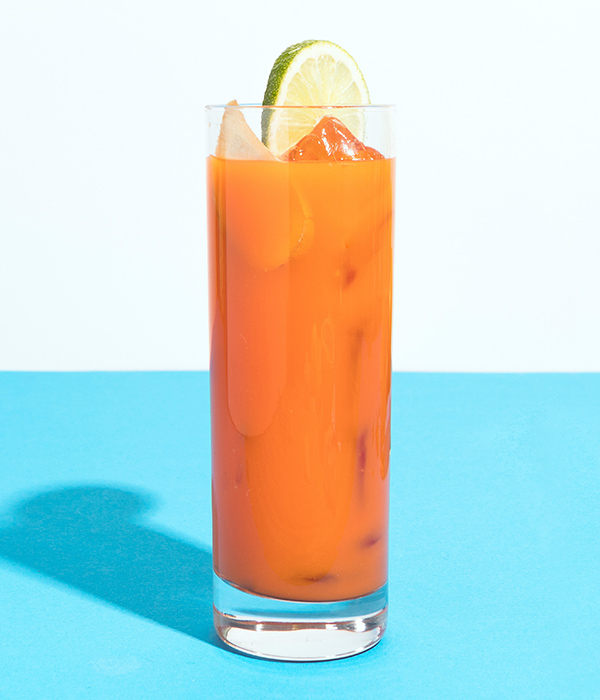 Kneus de schijfjes gember om de smaak los te maken en voeg ze met limoensap, siroop, wortelsap, rum en kokosrum toe aan een shaker of maatbeker en meng goed. Zeef, verwijder de gember en schenk de mix in een hoog met ijsklontjes gevuld glas en top af met een klein scheutje bruiswater.