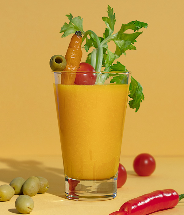 Brunchklassieker pur sang: tomatensap opgekrikt met vodka. In de Yellow Mary maakt de ‘bloody’ rode tomaat plaats voor zijn gele zusje. Net iets milder, zoeter en toch met die typisch hartige smaak.