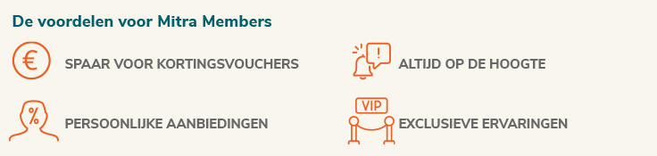Als Mitra Member spaar je zowel in de winkel als online via mitra.nl. Oftewel, Mitra schenkt voordeel! De Mitra Member klantenkaart kun je tevens toevoegen aan een van de bestaande wallet apps, zodat je de pas niet fysiek mee hoeft te nemen. Meer weten? Daarnaast is er ook de Mitra Member app. Zo heb je de klantenkaart altijd bij de hand en heb je overal inzicht in je puntensaldo en je actuele persoonlijke vouchers.
